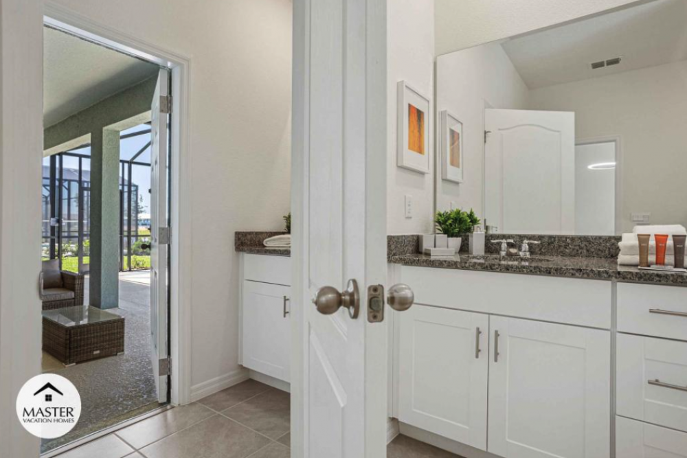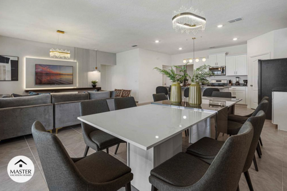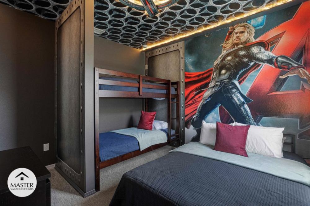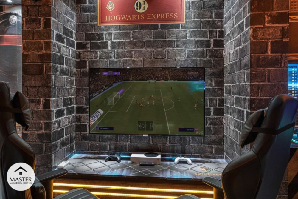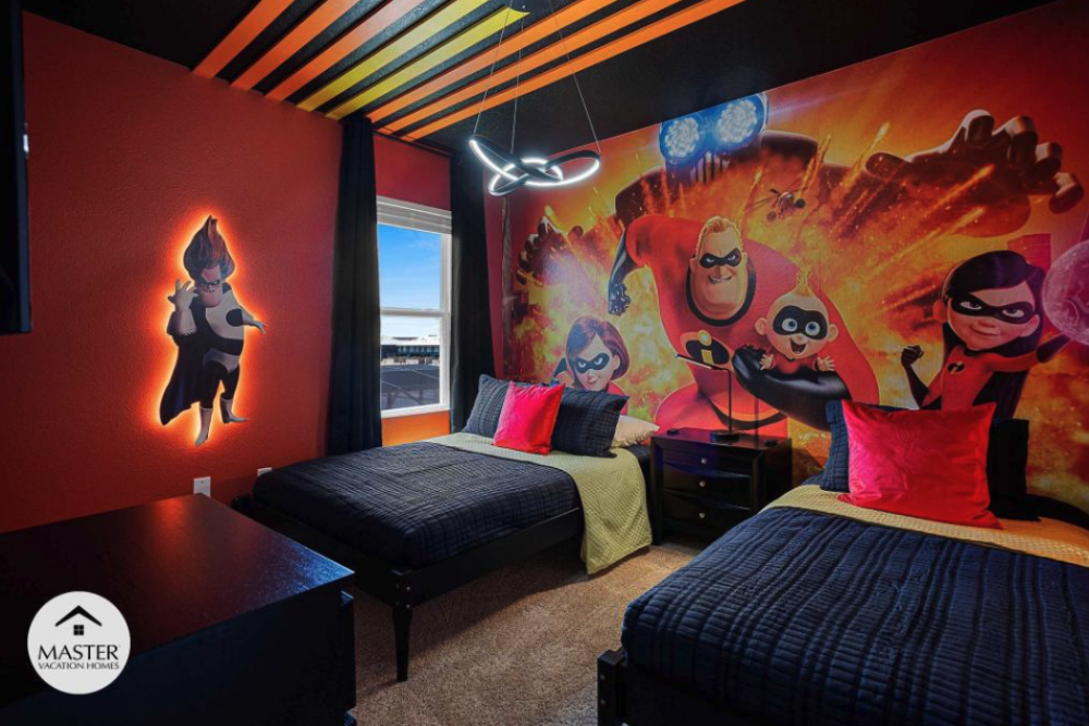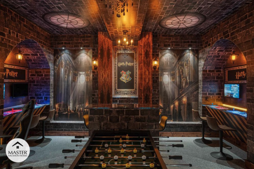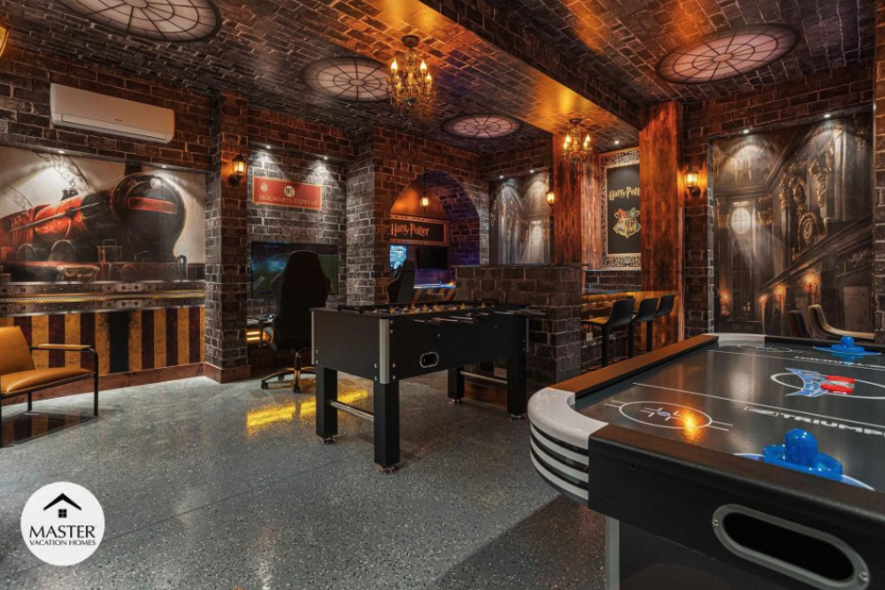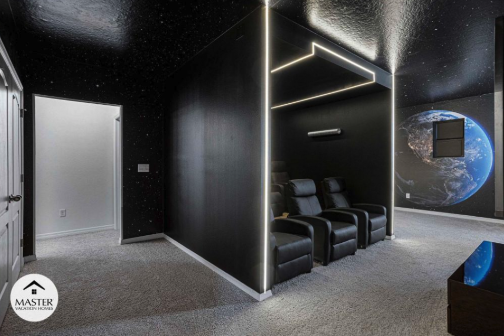 A casa de férias Theme House é temática e super moderna. Possui acabamento em alto padrão e muito bem decorada. Oferece 7 dormitórios amplos, sendo 3 suítes e 1 banheiro tipo Jack n` Jill, cozinha equipada com eletrodomésticos de última geração, ambientes integrados estilo conceito aberto e uma belíssima piscina privativa, proporcionando aos hóspedes relaxar depois de um dia de parque com a família. Além disso, possui uma sala de cinema privativa e uma sala de jogos para diversão em família.